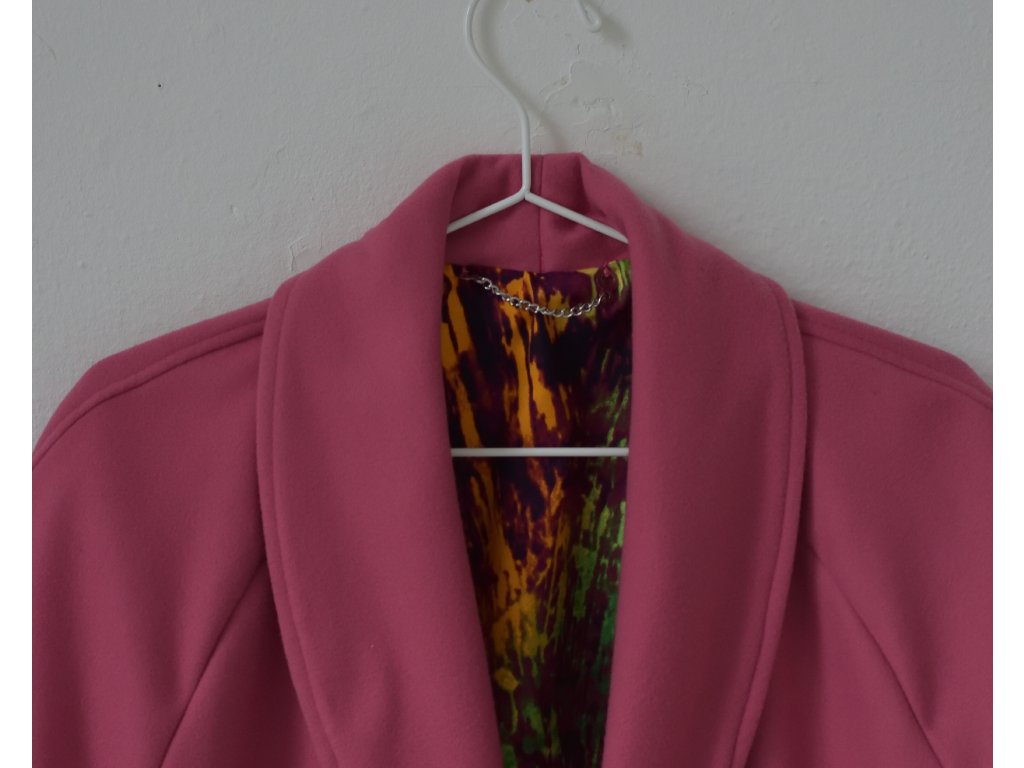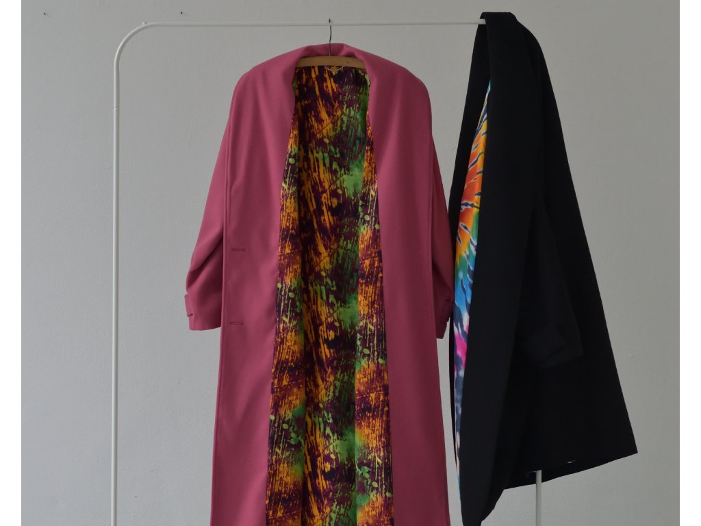 Kabát s africkou podšívkou v oversize střihu a raglánovými rukávy je originální kousek, který spojuje volnost a osobitý styl.